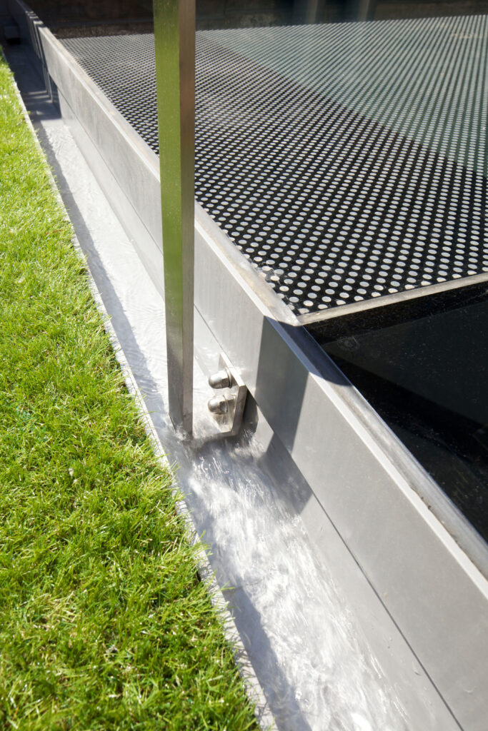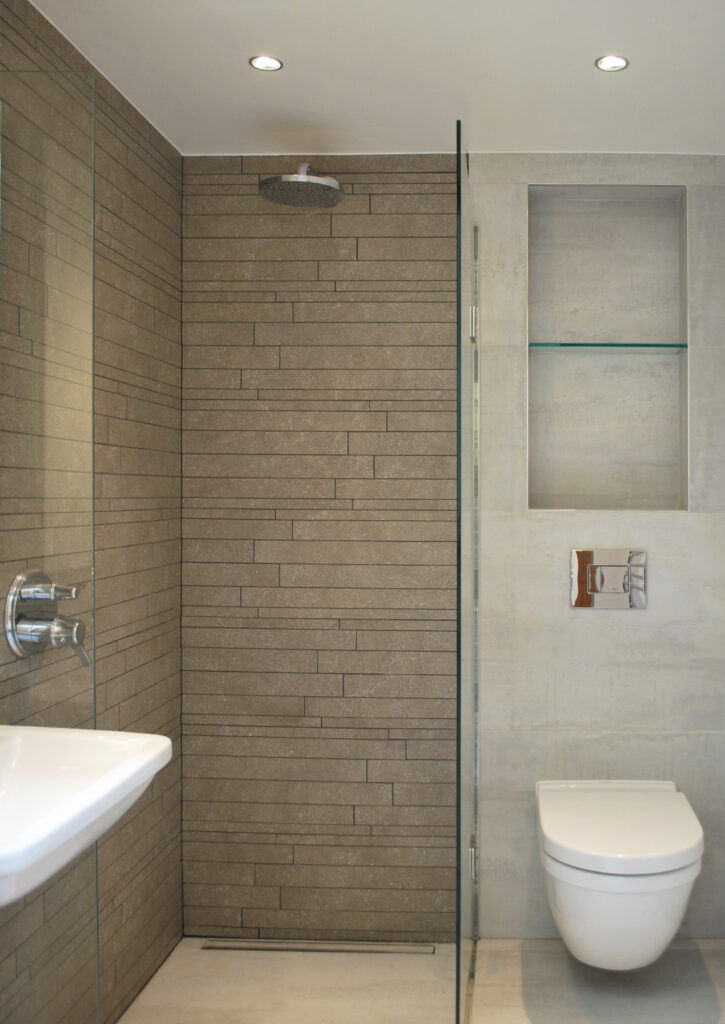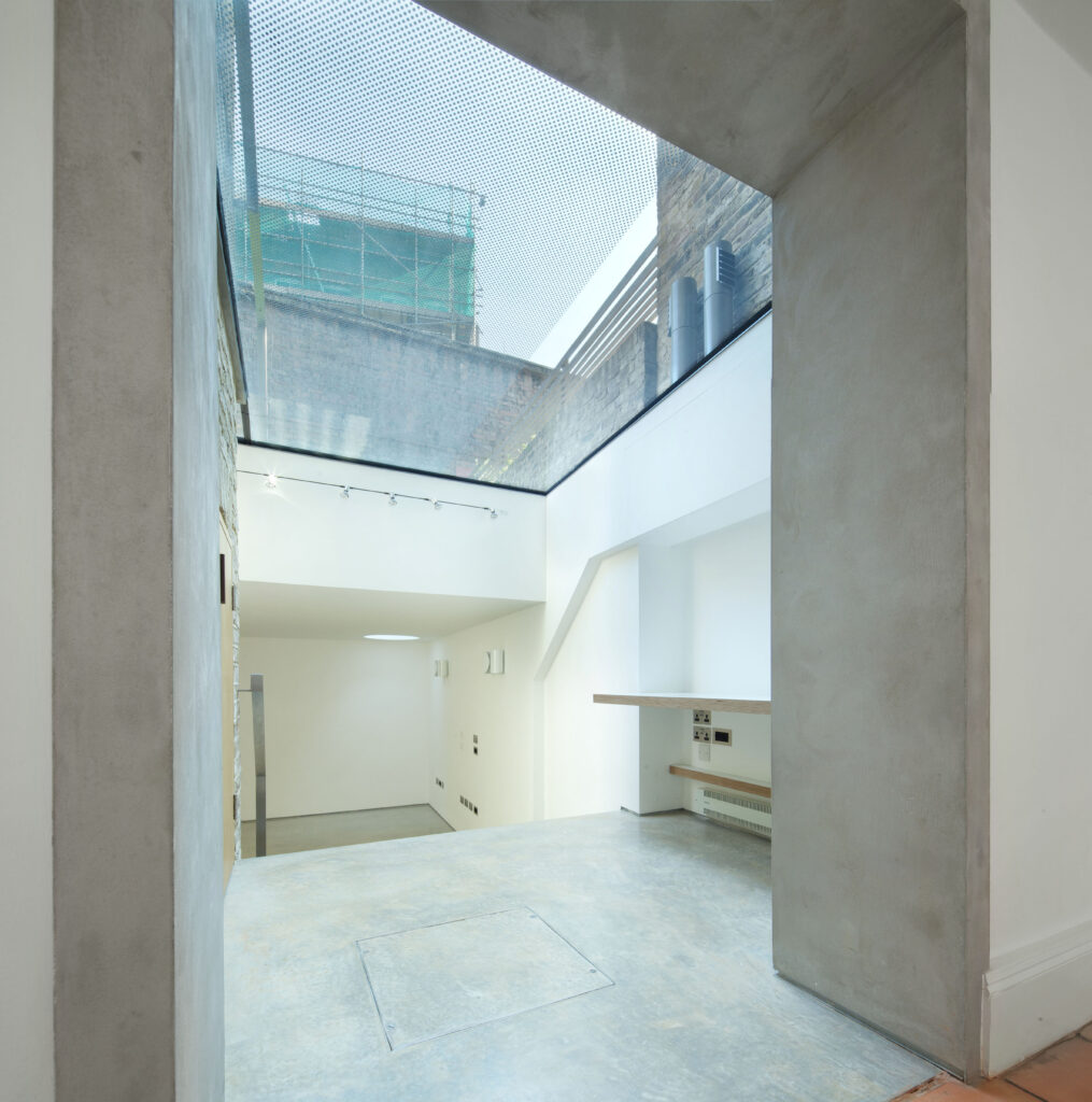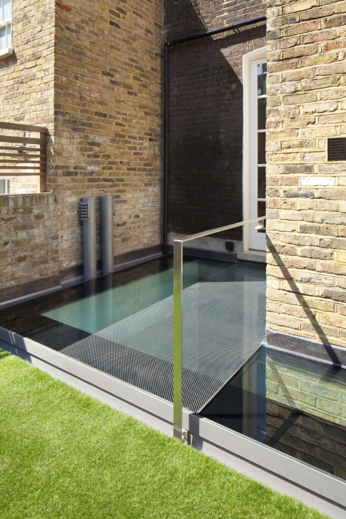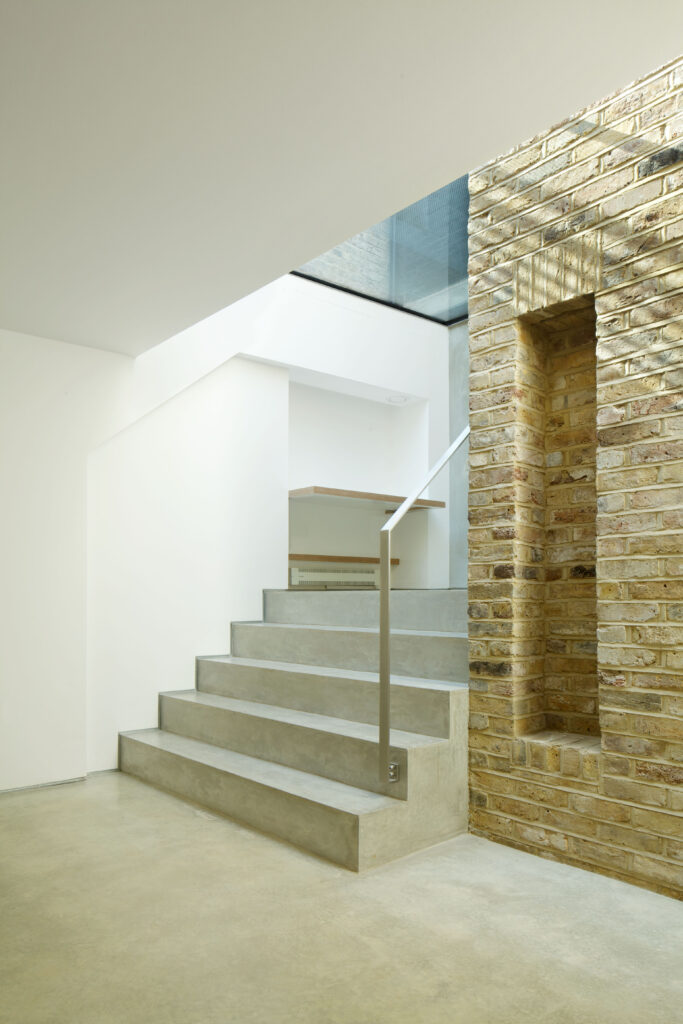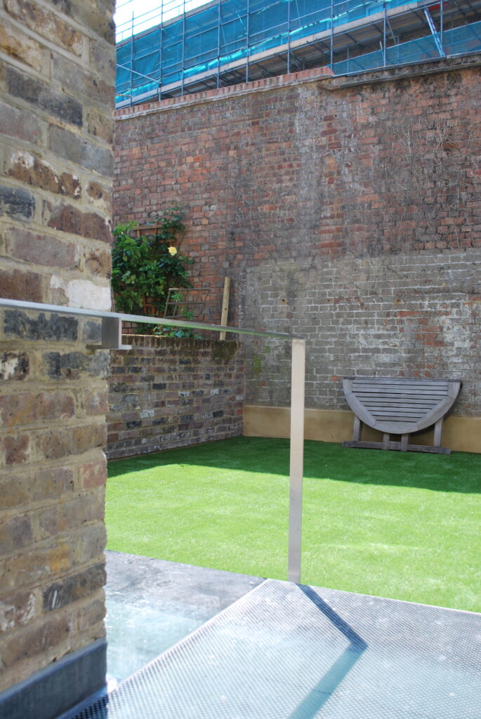 We removed and then replaced the garden on top of a fully insulated, well-ventilated concrete and masonry box. A new volume, built from reclaimed bricks, houses new shower / utility space to make a third storey underpinning under the old rear ‘closet’ wing.
