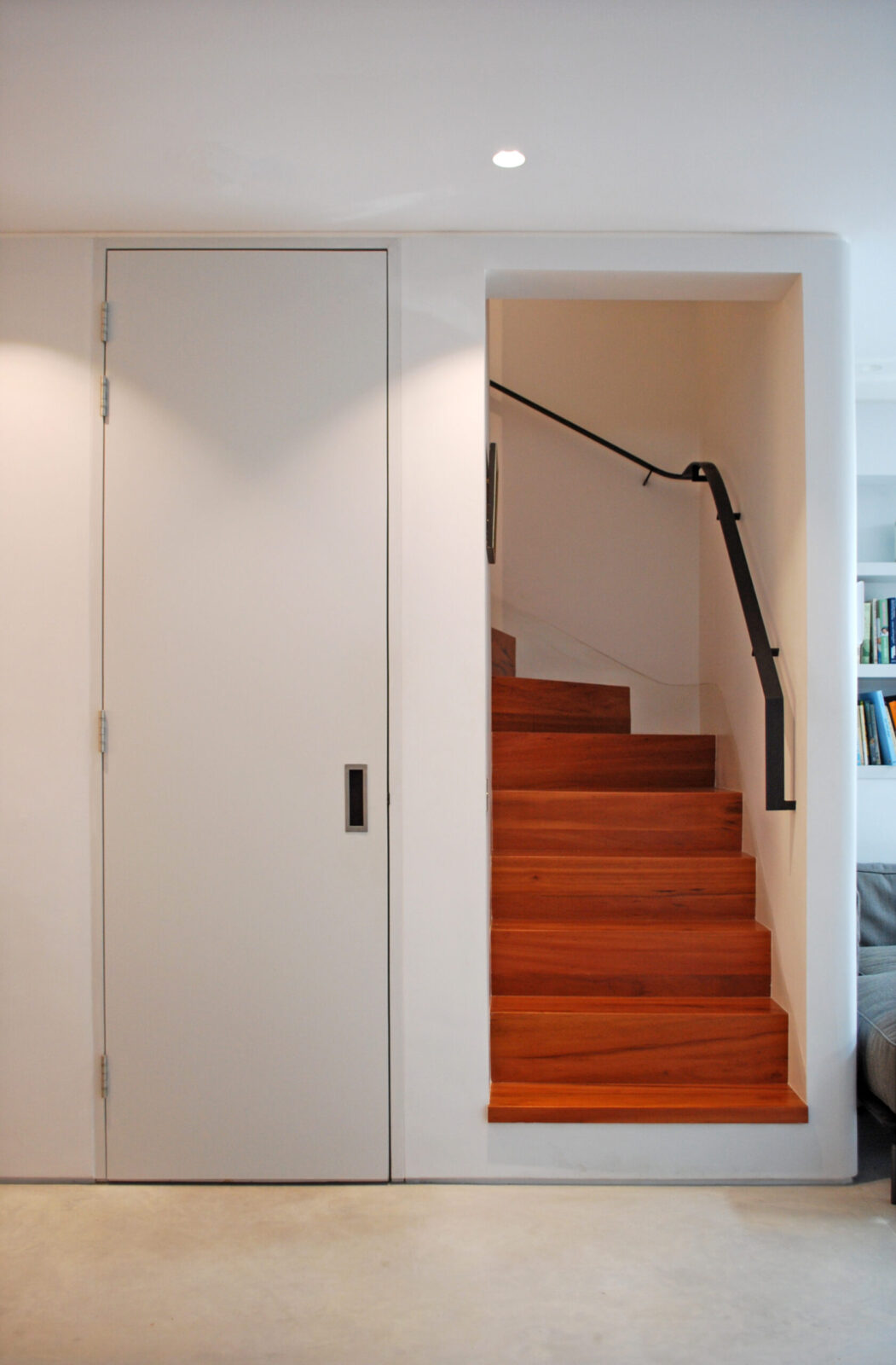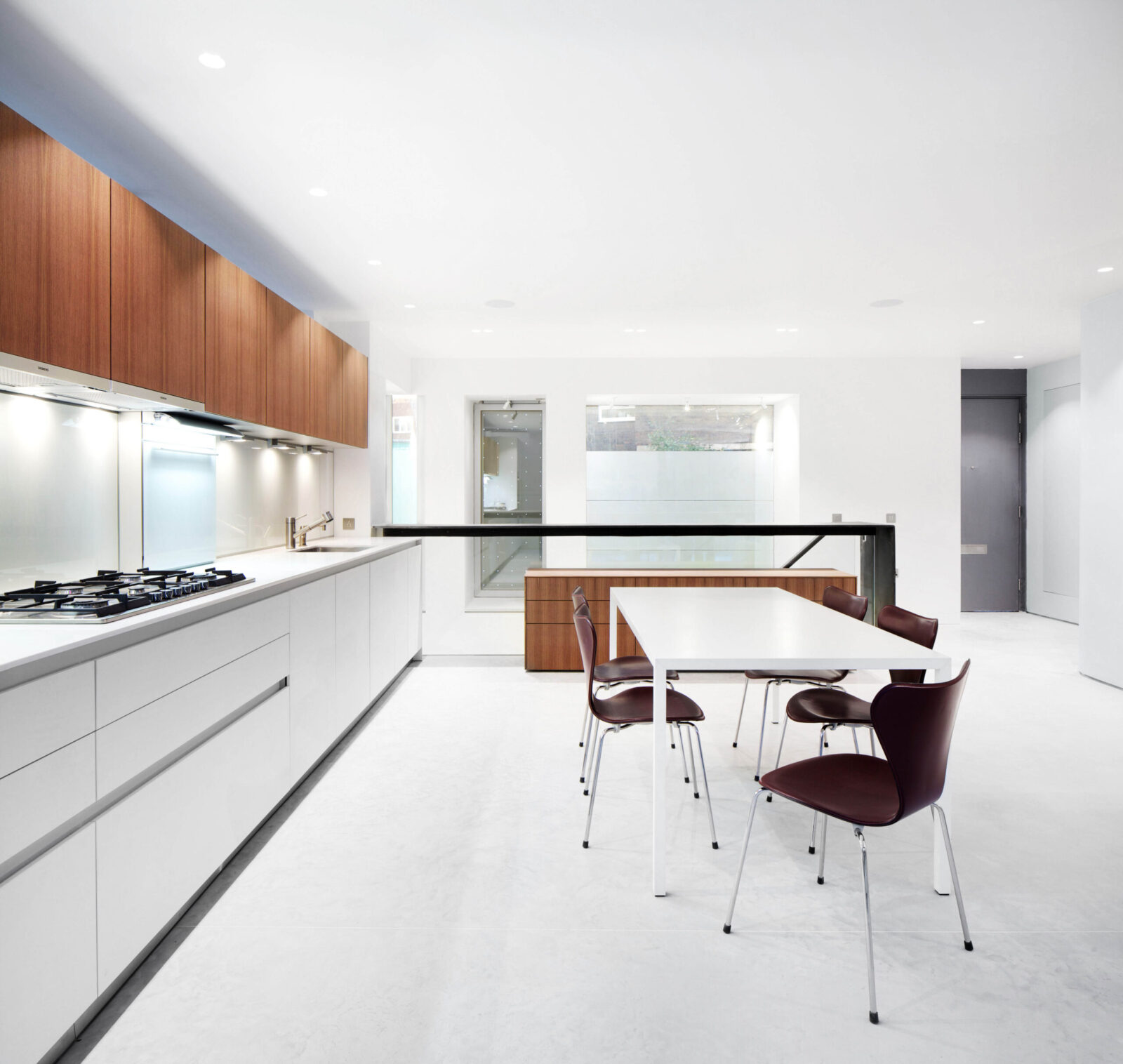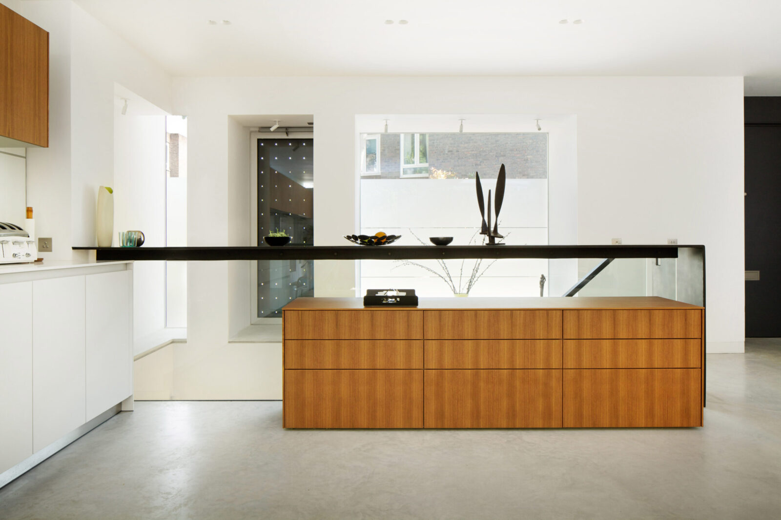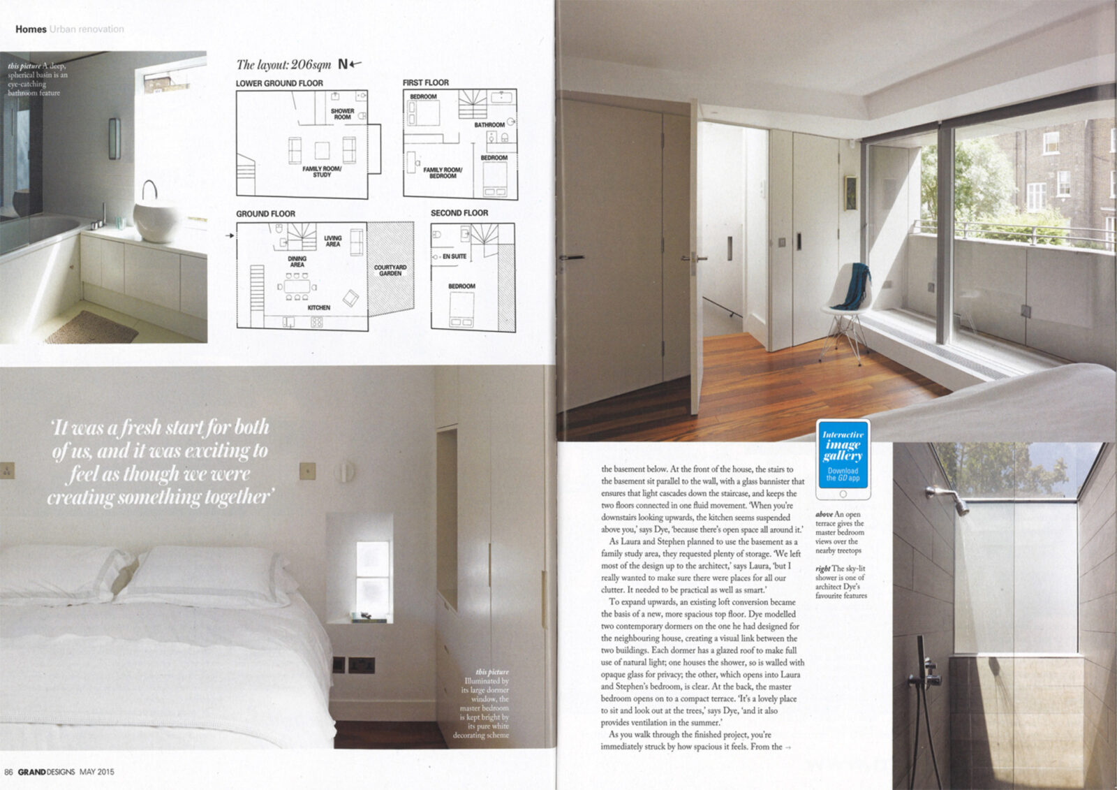 We unified the basement and ground floors with an open stair against a 2-storey front wall and a glass floor at the rear. A full-width glazed rear extension brought the courtyard garden into the house, while enlarged bedroom windows and an inset balcony dormer at the rear and glass dormers at the front opened the house to the sky.
