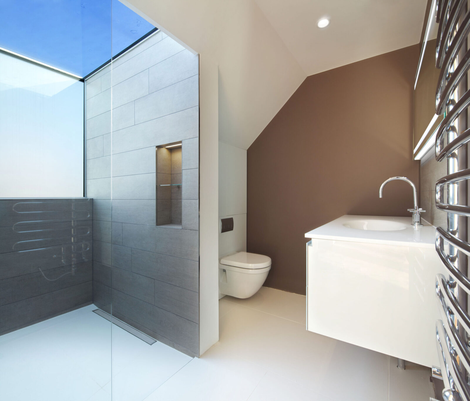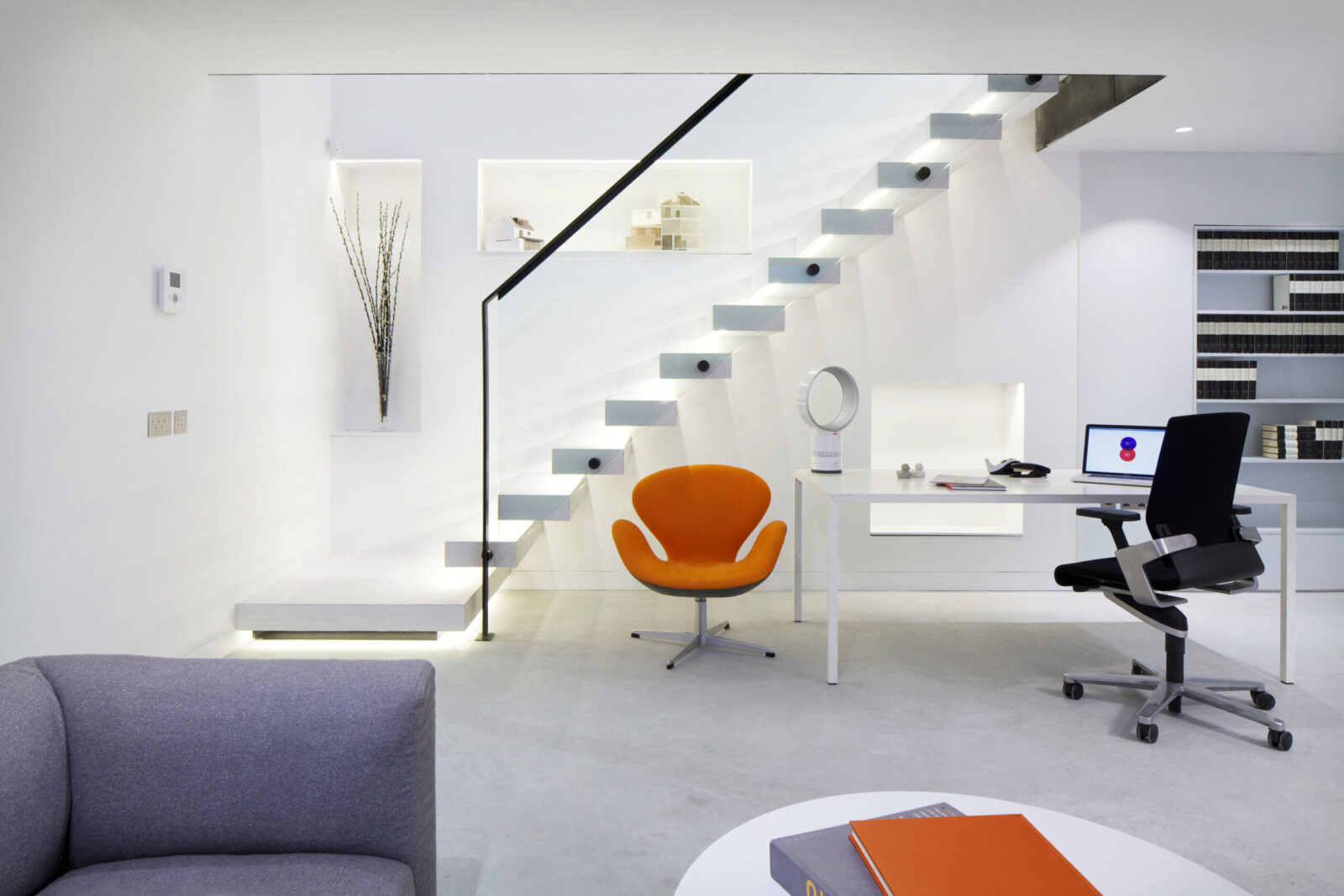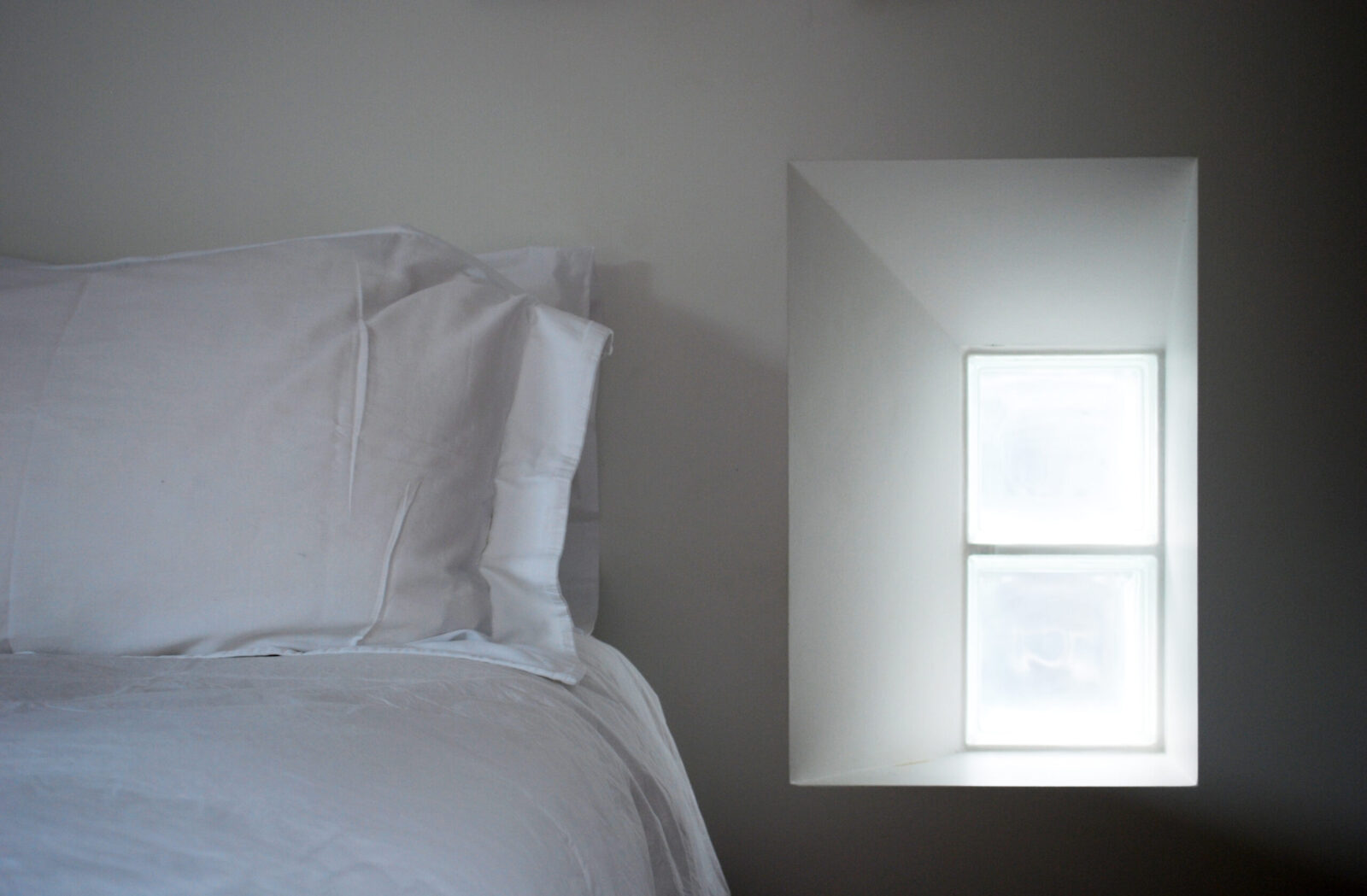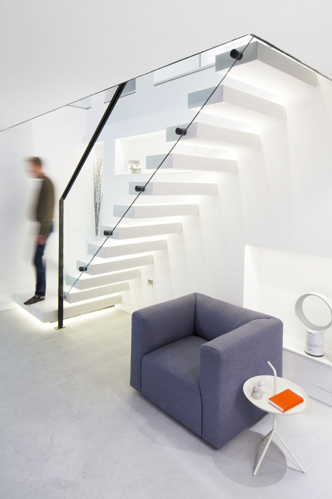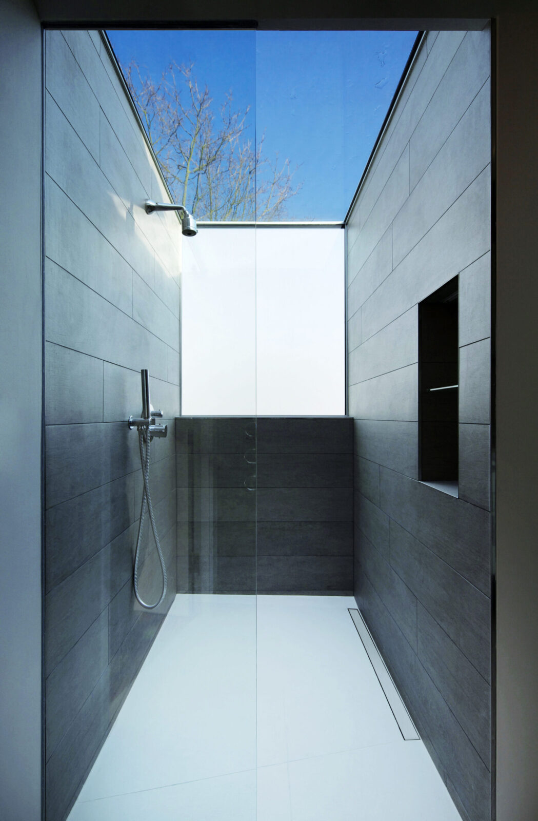 We unified the basement and ground floors with an open stair against a 2-storey front wall and a glass floor at the rear. A full-width glazed rear extension brought the courtyard garden into the house, while enlarged bedroom windows and an inset balcony dormer at the rear and glass dormers at the front opened the house to the sky.