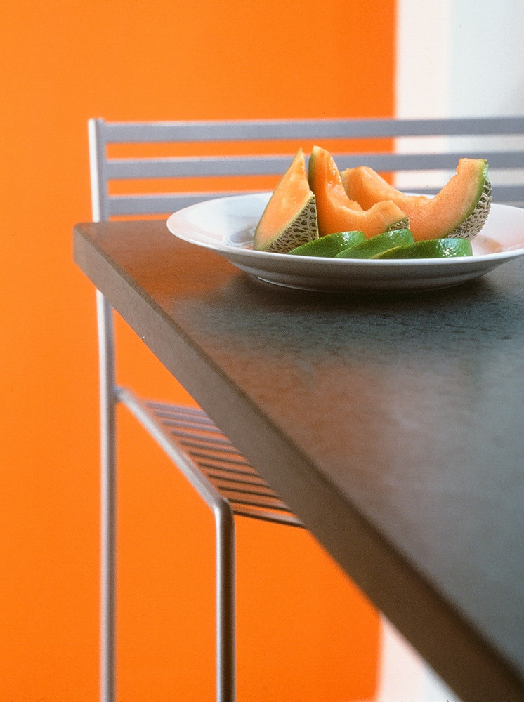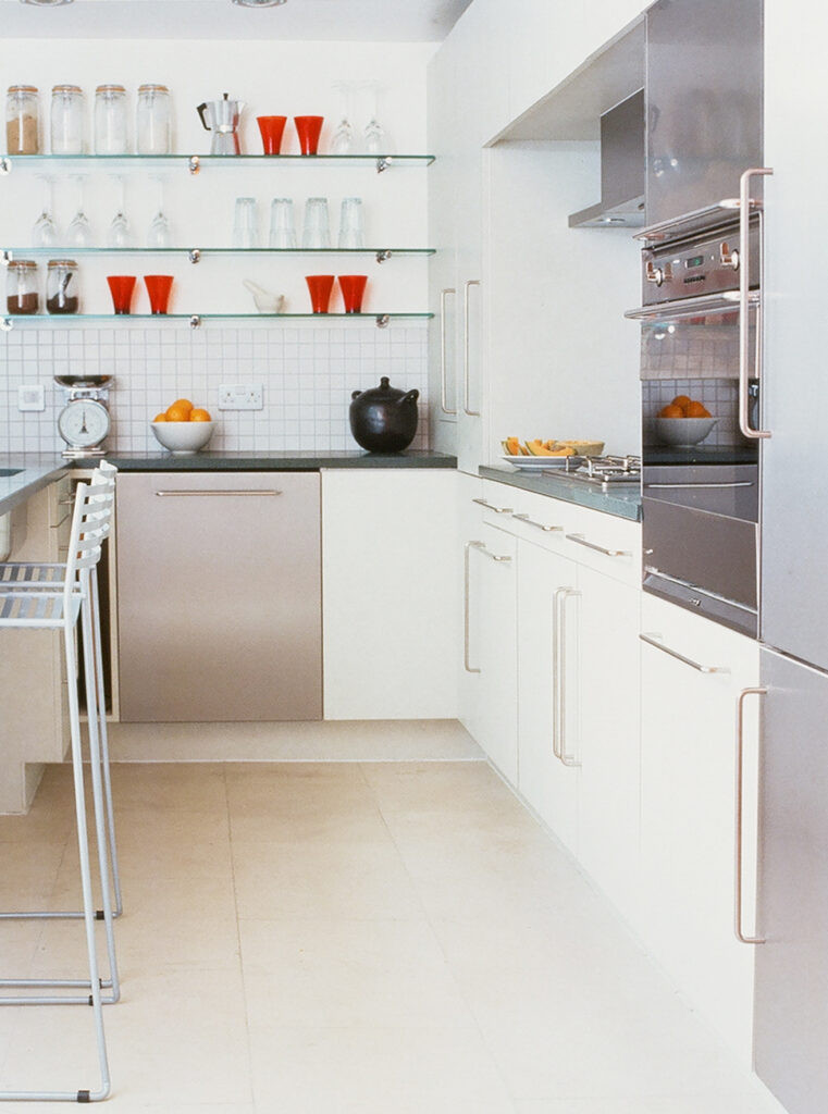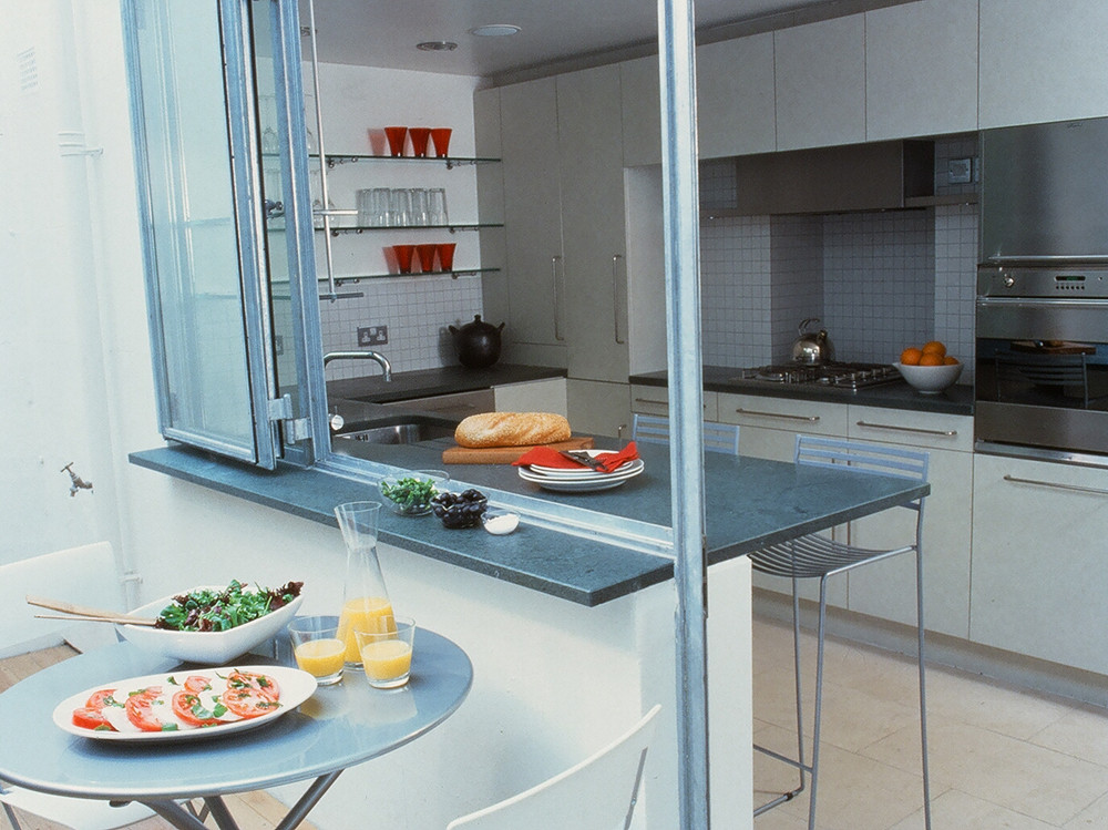 The client’s townhouse required complete modernisation, which was structured in phases. The rear ground floor kitchen was gutted and rebuilt with a wall of units and a new cantilevered stone counter. The wall was opened up to the courtyard with folding steel windows, allowing the kitchen counter to flow between inside and outside.