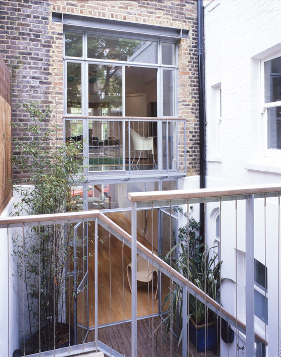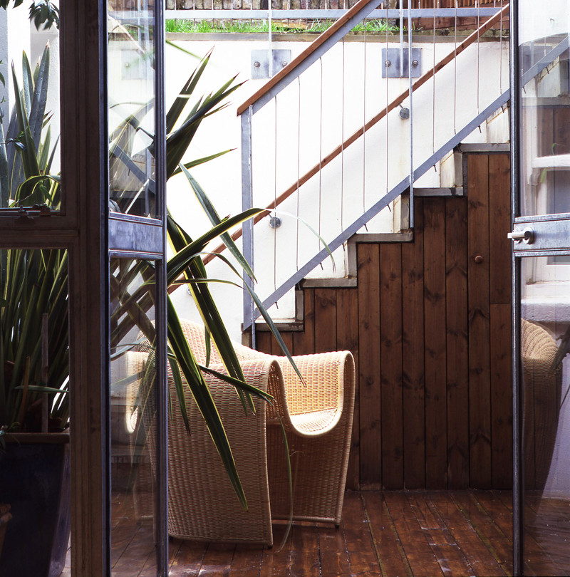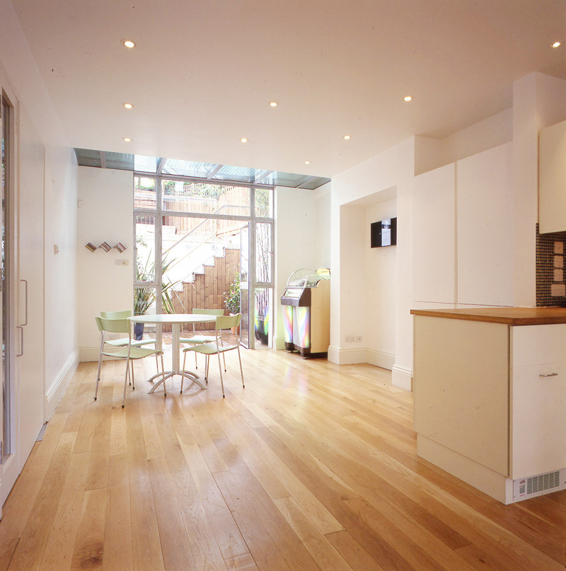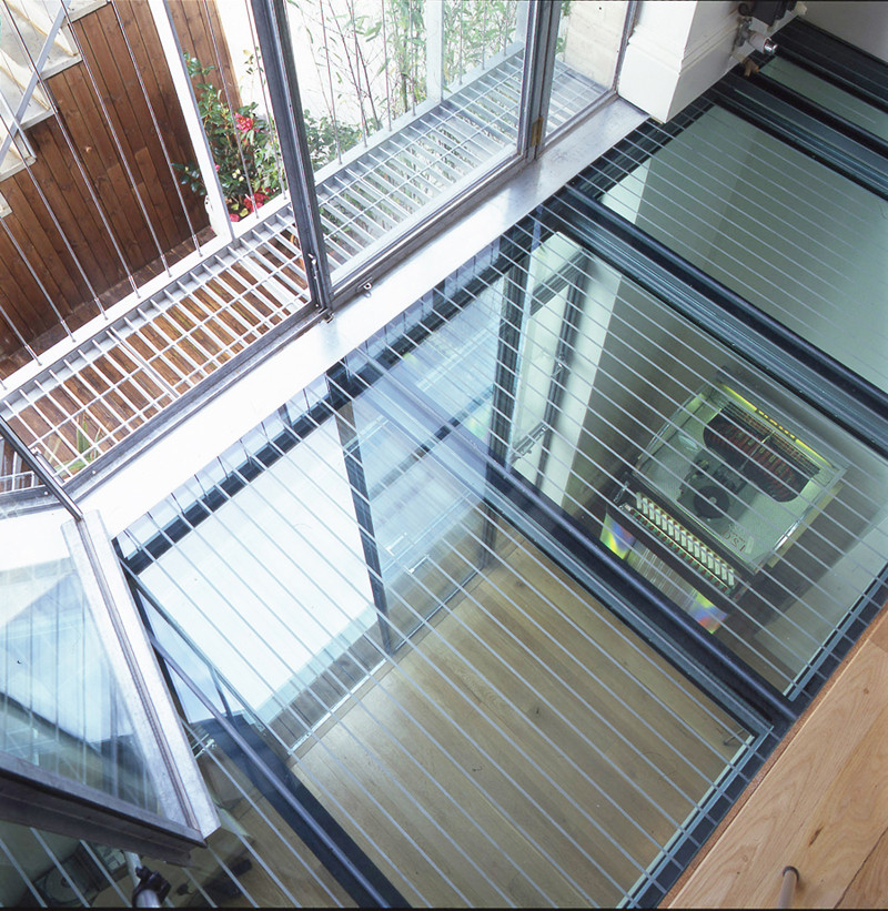 Built half into a hillside, the ground floor rear of the house was so dark as to be virtually uninhabitable. A modernisation scheme opened up a two-storey glazed wall at the back and introduced a glass floor at the upper level – this visually linked the kitchen/dining entrance level to the garden above, and flooded both ground and first floors with light.