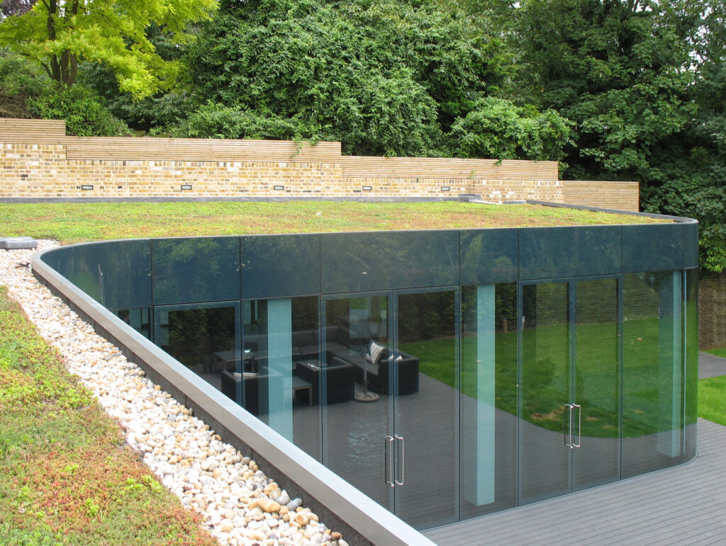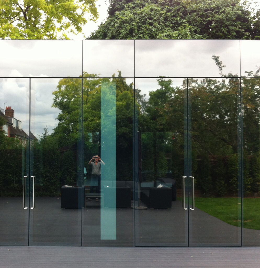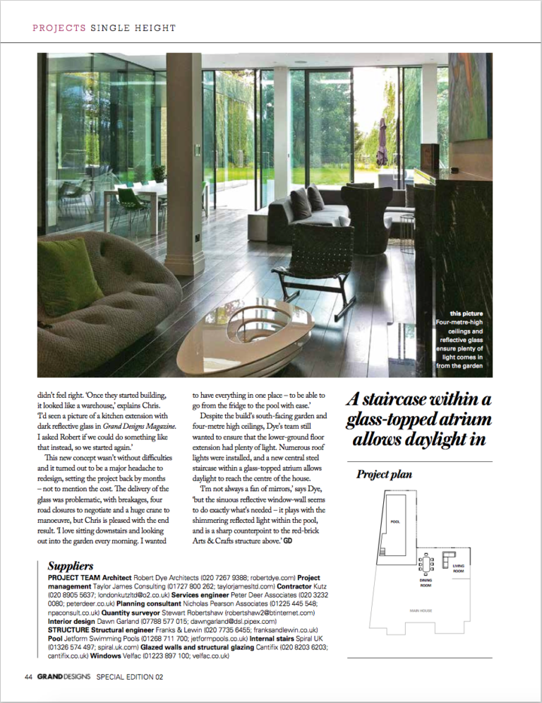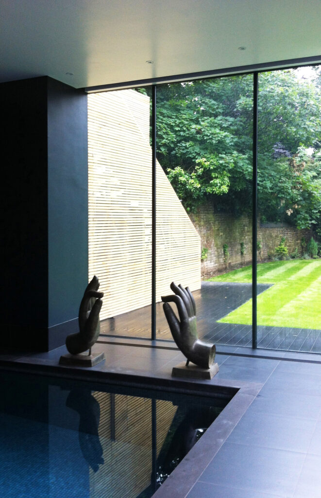 Architecturally, our client wanted to maintain the traditional feel of dormers, punched windows and red brick for the rear expansion of the upper floors. After a good deal of debate and experimentation, the solution we agreed was a stark counterpoint to this, with a sinuous ribbon wall of glass for the lower living and pool extension. The reflective treatment of the glass gives solar-shading but also heightens this contrast with the brick as well as giving a sense of all-around ‘landscape’ wherever viewed from outside.