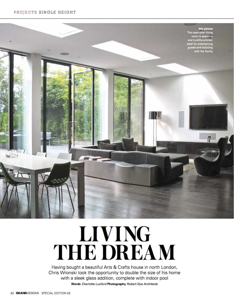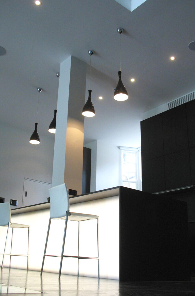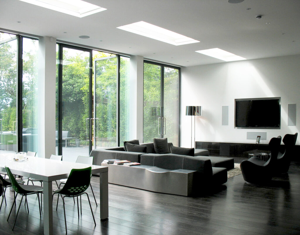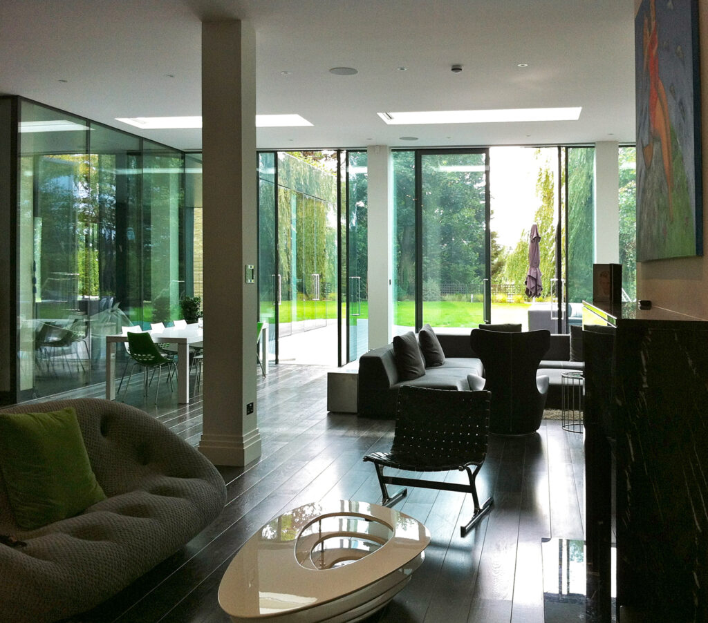 With playing fields at the bottom of the garden, our client wanted to explore the potential of a design that was more sympathetic to the site and opportunities in terms of levels and relationships to the landscape. Our proposals did this by extending the whole house towards the garden. We moved the main living space into the lower ground floor, with 4 metre high ceilings, full-height glass doors and skylights, to make a robust relationship with the garden and new pool house whilst giving lots of natural light.