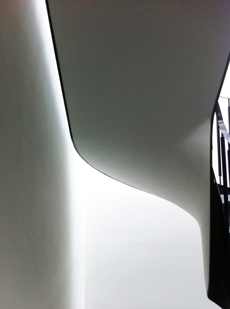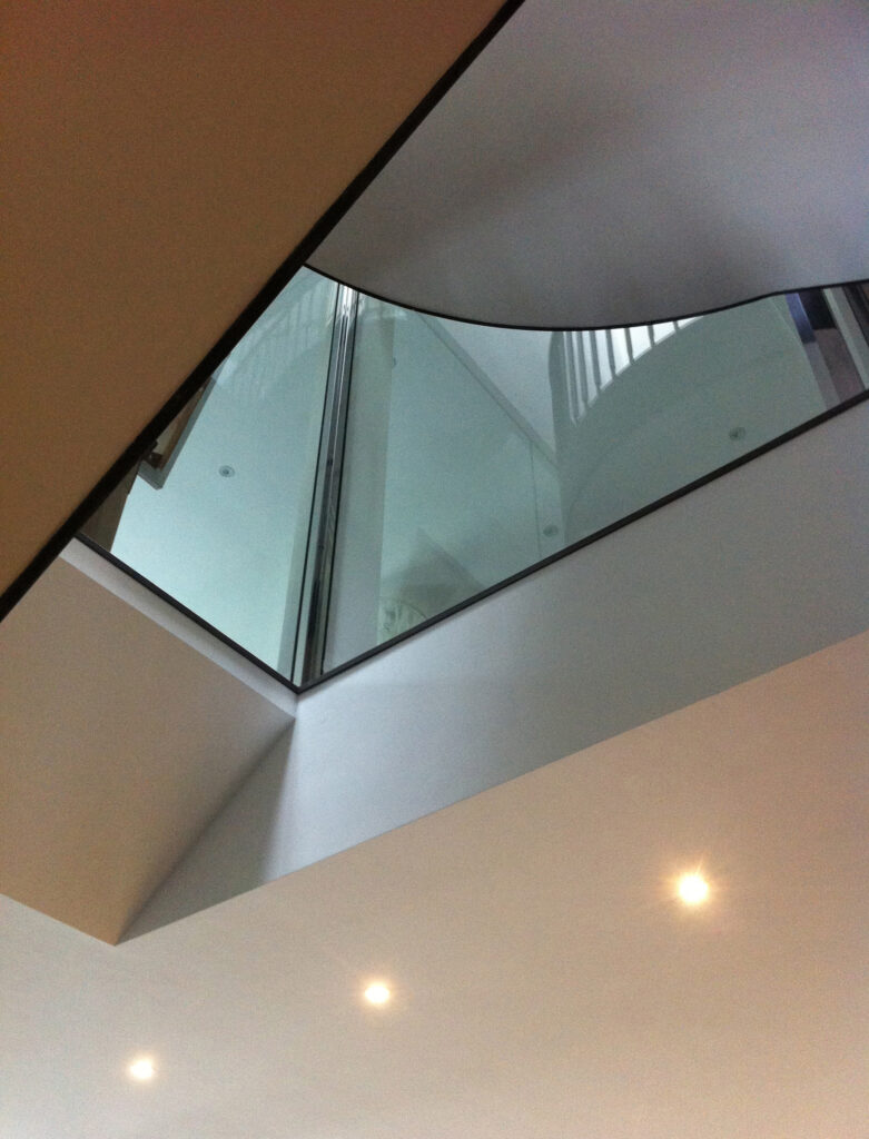 The rear extension makes a much deeper floorplan than before, so we had to work hard to get light into the middle of the house. Our solution is a new steel central staircase rising in a glass-topped atrium that drops open-plan from a glass-sided entrance hall or climbs in sweeping curves up to the bedroom floors. At the very top, the expanded loft floor has new bedroom space with 3 large dormer windows giving views over south London.