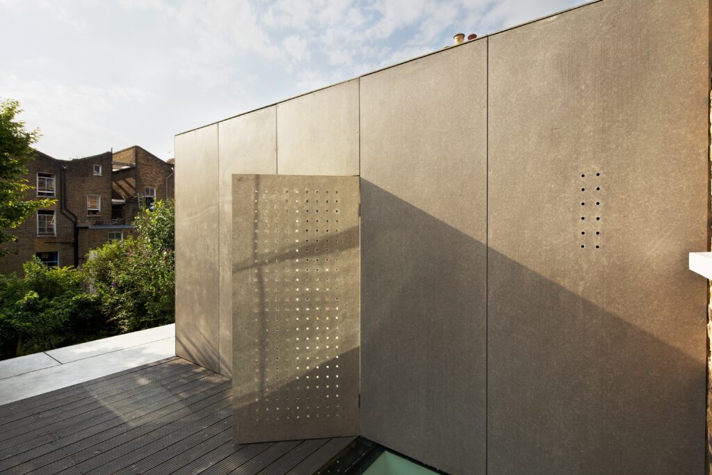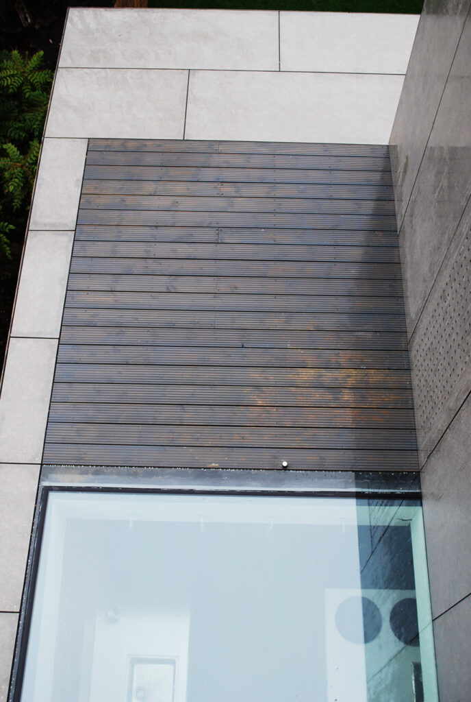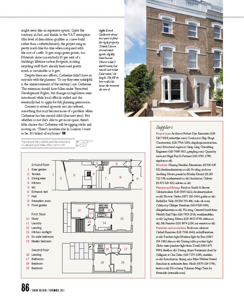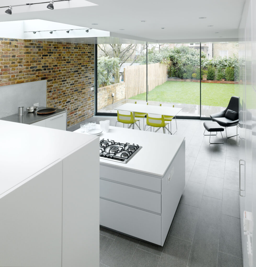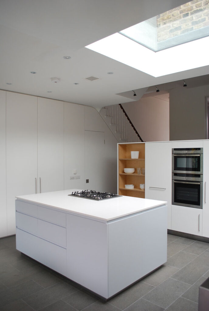 The finished building is a modern two storey re-build and expansion which for planning reasons follows the outline of the demolished original at the rear upper storeys, side and street front. On the rear ‘extension’, recycled brick side walls grip modern open-plan living space, wrapped up and over by artificial-slate walls and roofs. These extrusions bear the new faces to the garden – fully glazed at both levels. Sliding doors to the garden are strategically inflected at an angle in plan, focusing the view towards the church spire in the urban gap at the end of the surrounding gardens. Skylights in all the roofs economically target light deep into the house.