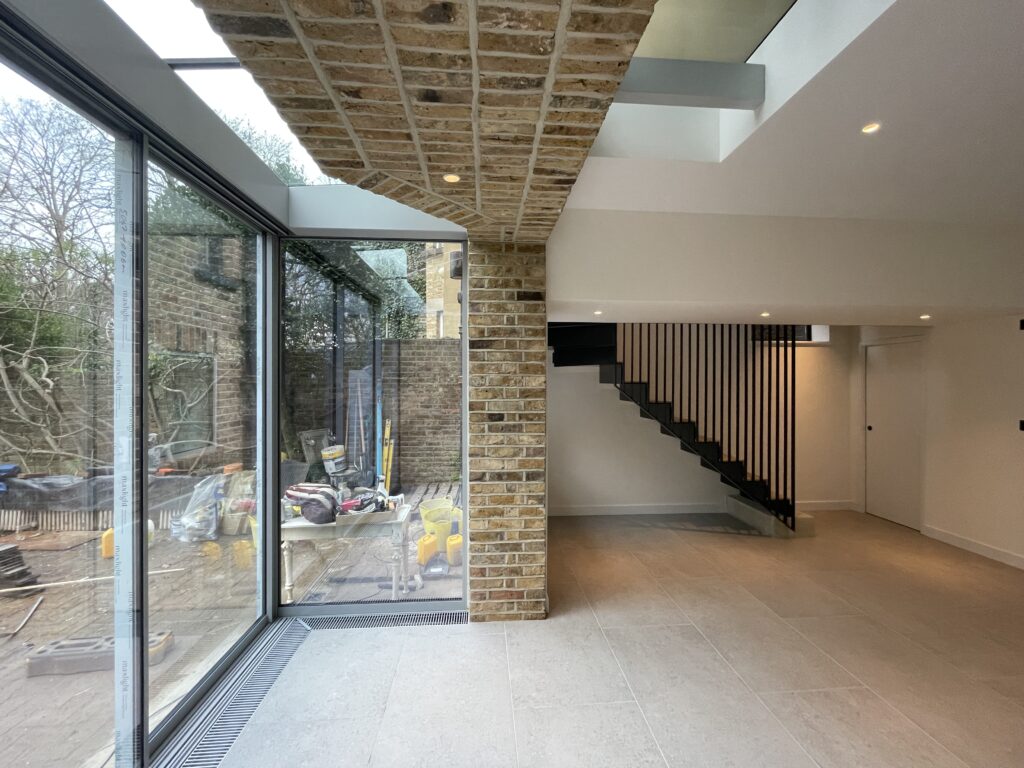 We achieved this by removing the lower half of the bay window at the Lower Ground Floor, replacing it with a plinth like glass extension. Not only does it honour the bay at Upper Ground Floor but it also reinterprets the Victorian bay window, characteristic for historic houses of the local area. The transparency of the extension, creates the visual effect of the retained bay to be seemingly floating above it as well as bringing the natural light into the Lower Ground Floor. Large glass sliding doors allow for expansive views of the garden and improve access to it from the Lower Ground Floor which was previously restricted by the small opening in the existing bay window. The site posed particular challenges due to a flood prevention sewer being located under the ground at the rear of the building. However, the project overcomes this constraint by designing the extension to cantilevers off of the existing bay and rear façade, creating a structurally demanding double cantilever.