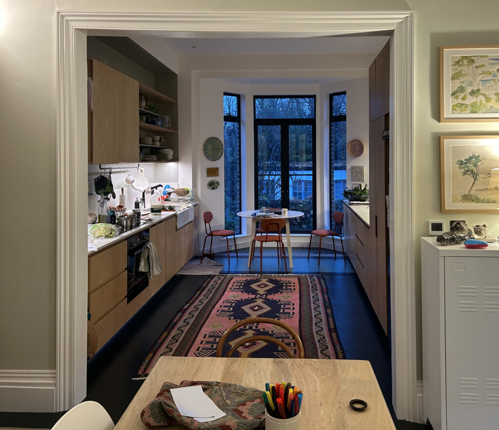 The kitchen itself which is linear in its layout leads the eye towards the bay window that offers an ideal seating opportunity to enjoy a meal surrounded by the trees and greenery. The Overall layout and materiality of the design reconnect the property to its context and take advantage of its location just behind Hampstead Heath, one of London’s largest parks by emphasizing views of it.