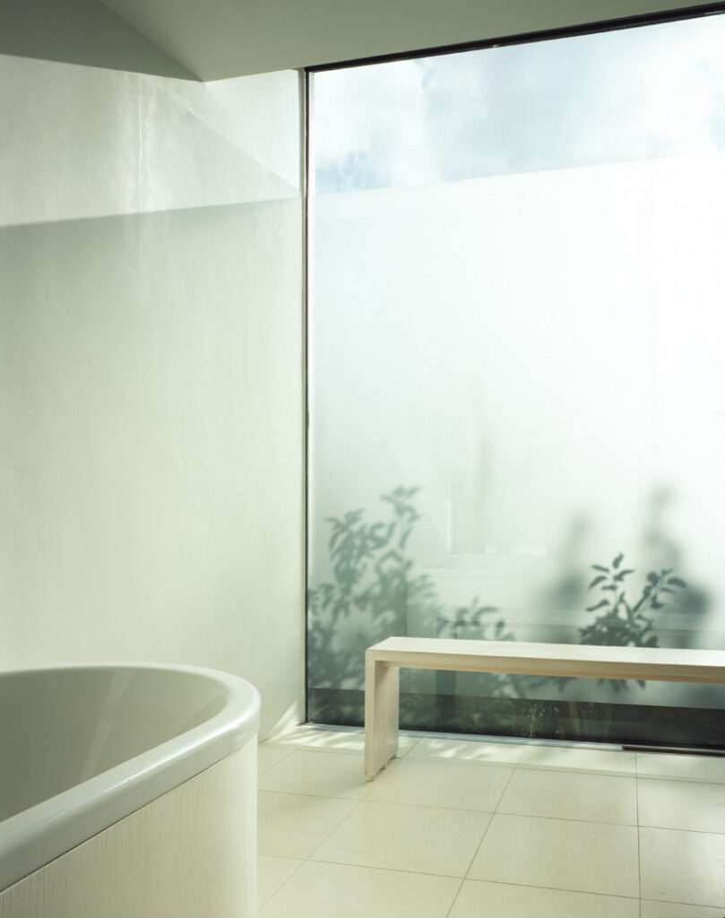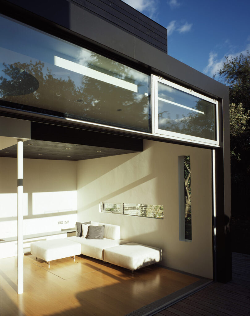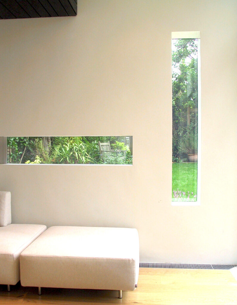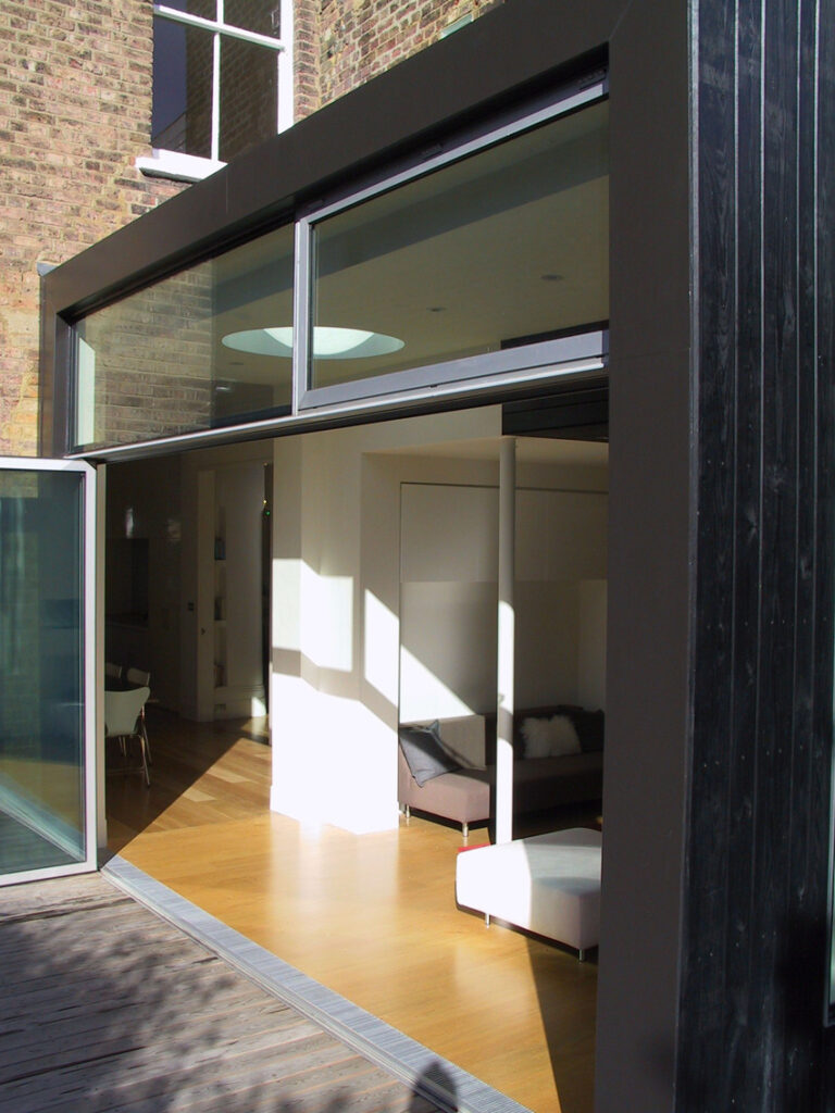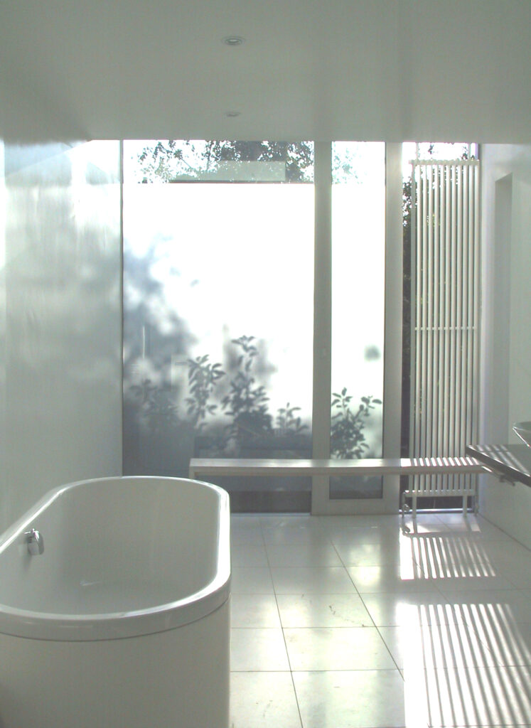 Inspired by our client’s love for childhood memories of ‘inside/outside’ modernism in India, the garden and first floor rear was opened to the garden and the sky. The rear family room opens completely along one side with bi-folding glass doors onto the new decked outdoor eating space. The master bathroom above has a narrow sliding window that opens behind a fin-radiator as privacy screen.