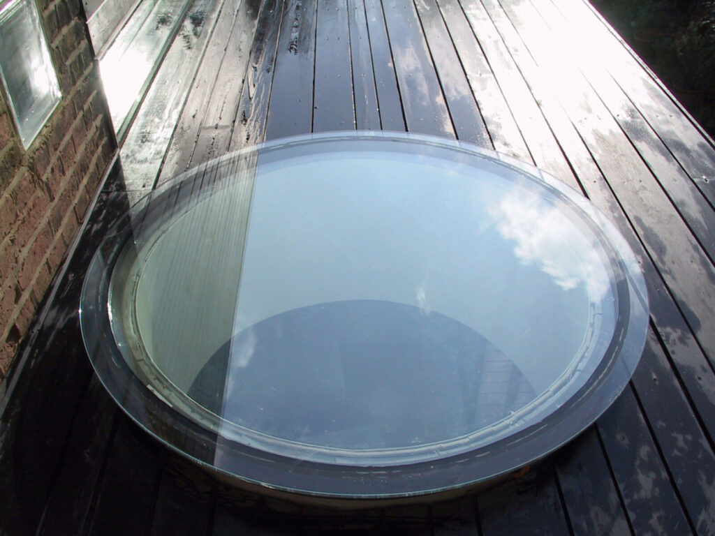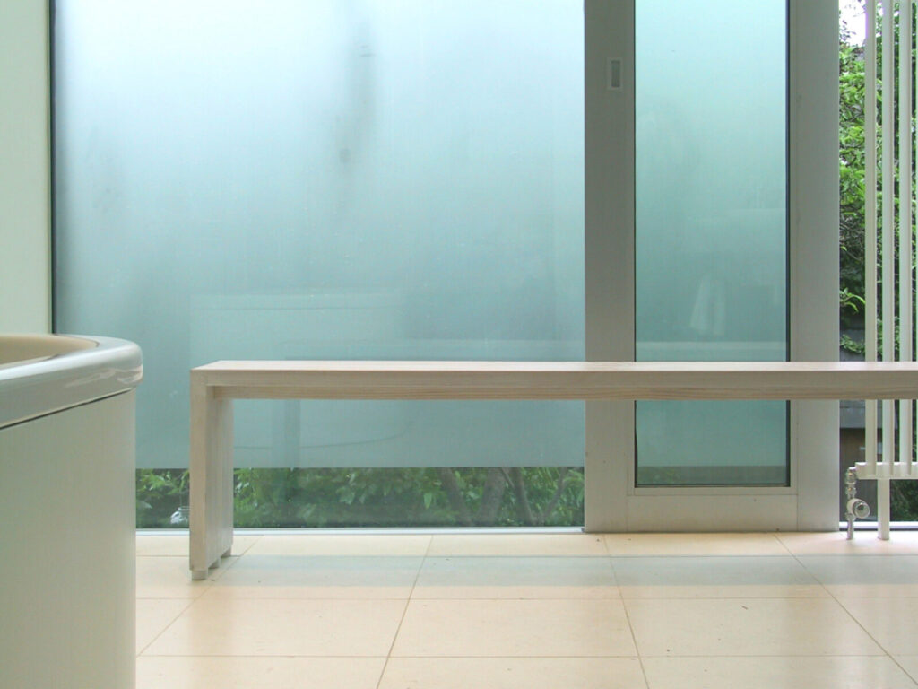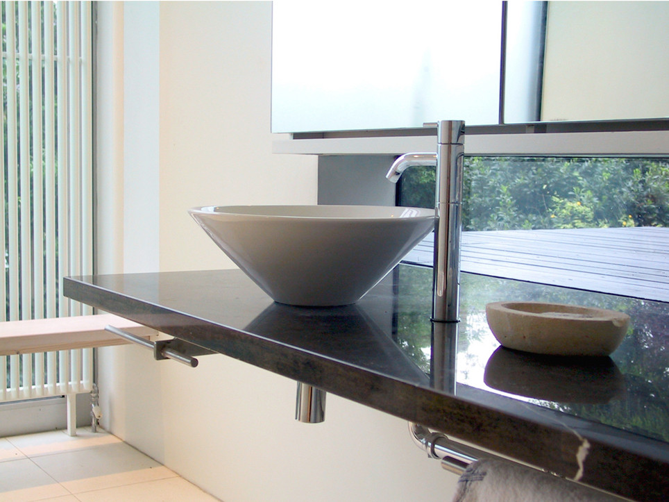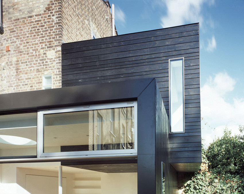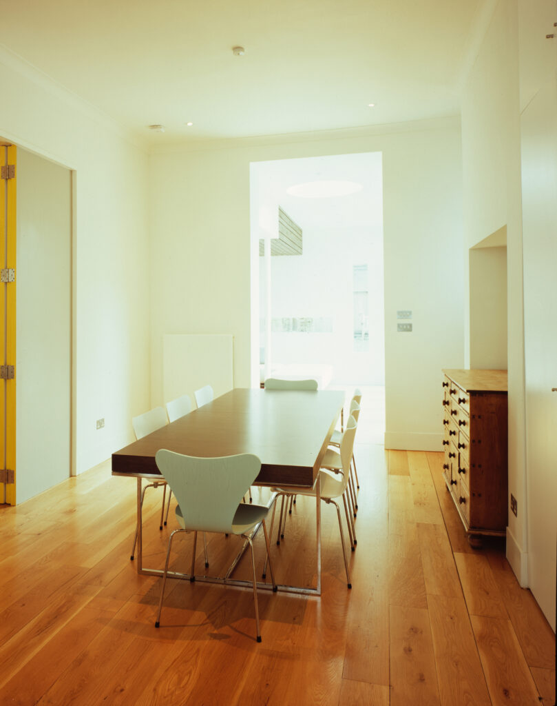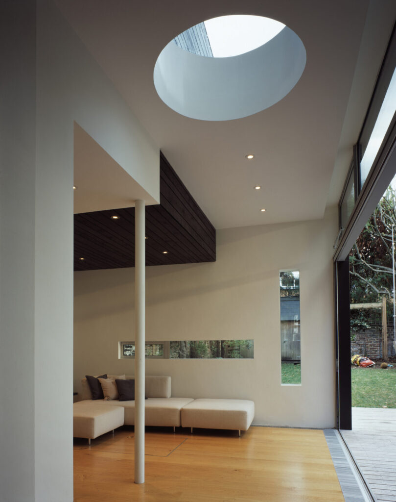 Inspired by our client’s love for childhood memories of ‘inside/outside’ modernism in India, the garden and first floor rear was opened to the garden and the sky. The rear family room opens completely along one side with bi-folding glass doors onto the new decked outdoor eating space. The master bathroom above has a narrow sliding window that opens behind a fin-radiator as privacy screen.